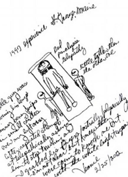 我隐约地看到一些体型较小的小灰人在我身体右侧,一些体型较高的小灰人在我身体左侧,我还记得当时我对他们说:“请停止下来!我不希望你们碰我!”我对他们说了三次。之后在一股神秘白光下我又处于眩晕状态。