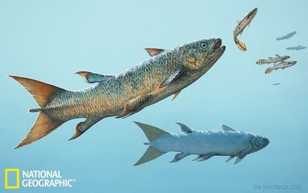 这是一张示意图,展示的是在三叠纪的海洋中,一种名为“Rebellatrix”的鱼正在追逐它的猎物。这种鱼是科学家们最新发现的空棘鱼新种。