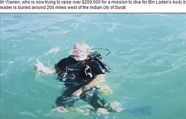 这位寻宝者名叫比尔·沃伦(Bill Warren),现年60岁。他称发现了拉登遗体的具体位置,就在距离印度西部港口城市苏拉特(Surat)以西320公里处的阿拉伯海底。他现在正努力筹集20万美元(约合126万元人民币)经费,以潜入海底寻找拉登的装尸袋。