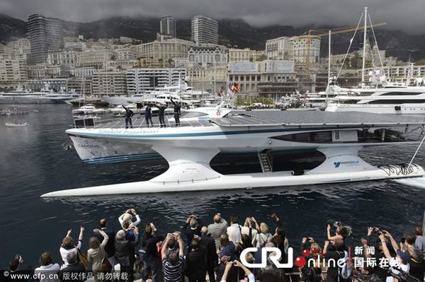 当地时间2012年5月4日,摩纳哥,瑞士注册的太阳能动力船MS Turanor PlanetSolar成功完成绕地旅行后,抵达摩纳哥赫居里士港,受到民众的热烈欢迎。
