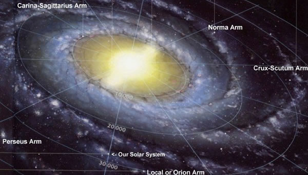 银河系的棒状核心与数条悬臂分布图
