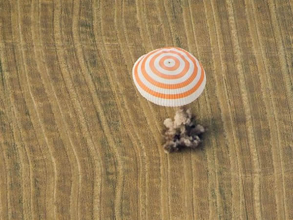 一幅鸟瞰图记录了“联盟”号(Soyuz TMA-22)宇航飞船于4月27日在哈萨克斯坦着陆时的情景。这艘俄罗斯飞船刚从国际空间站返回,船上载有丹-博班克、安顿-什卡普勒罗夫和安纳托利-伊万尼辛等三名宇航员。在经历了6个月的太空生活后,他们终于跟随“联盟”号回到地球。