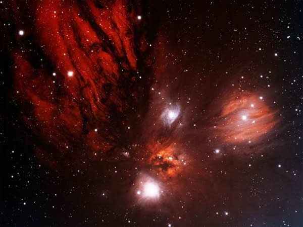这是猎户星座中一连串宇宙尘埃放射出的微弱热量产生的橙色轮廓图,图片来自于欧洲南方天文台。该图是由在智利的阿塔卡玛探路者实验望远镜拍摄的,其使用了能够捕捉另外一些暗冷星际尘埃轮廓的亚毫米波长。观测结果被放置于该区域可见光层的最上层,用来确定该星云在天空中存在的位置。