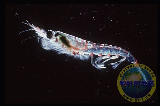 在对南极食物网的一项研究中,科学家们发现生活于海洋表面的叫磷虾(krill)的一种动物,主要集中在南极冰层边缘的南边的一个带状区域。南极磷虾(学名Euphausia superba)是南大洋的一个关键物种,在其生命周期的一个特定阶段它们以海冰面下的藻类为食。磷虾种群数量的下降对南大洋生态系统影响巨大,还会影响到商业性渔业生产。自从注意到以磷虾为食的鲸类聚集于海面冰层边缘之后,科学家们推测磷虾也聚集在冰层下。一个由英国科学家组成的研究组利用自动水下仪器观察到从冰层边缘向内一直延伸到22公里的冰层下分布有大量的磷虾群。在这个仪器上有发送声波的装置,利用回声可以探测磷虾的密度和分布。根据这个信息,Andrew Brierley及其同事发现在冰层下1—13公里厚的条带上大磷虾的数量更为丰富,比暴露海面高5倍之多。