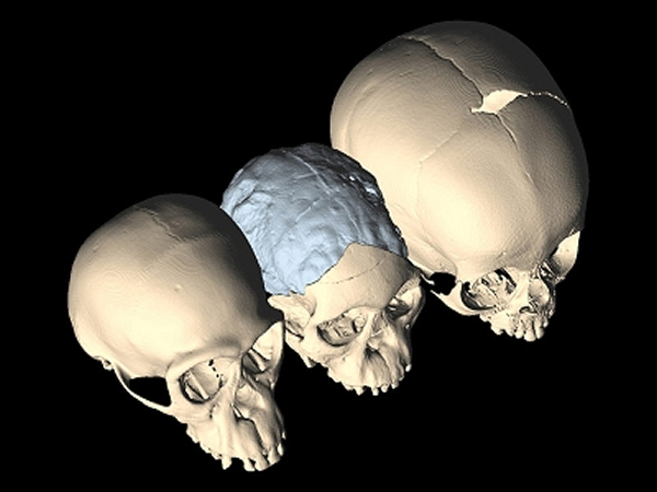 黑猩猩(左)、南方古猿(中)、右(现代人)幼儿的颅骨愈合情况