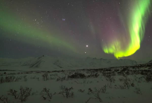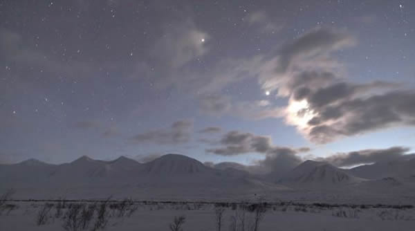 哈特是名水力发动机工程师,利用二三月这段时间,在加拿大育空地区冰天雪地的北部,拍到这些照片。他说:“晚上,金星和木星比其他任何星球都亮,和月亮连在一起时会创造出一个惊人画面。夜幕降临时,它们成为夜空中最显眼的星球。与此同时,我还希望出现北极光。当时,我有这个预感。近20年来,我一直都在拍摄夜空。这种极端的天文学冒险是迄今为止我所经历的最大的摄影挑战。我来到育空地区北部时,气温约是零下40摄氏度。我在外面进行拍摄时,气温常在零下二三十摄氏度。我只身在外进行过多次探险,有一次我就睡在一辆卡车后面,那时气温很低。”