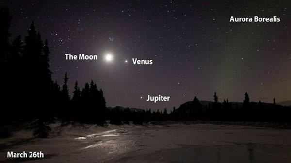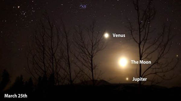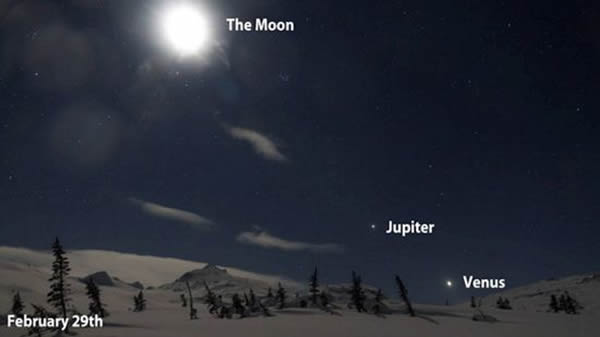 一连串的照片显示2月时木星高悬在夜空中,金星位于它的下方。但木星朝太阳方向移动,每晚都会变得越来越低,与此同时金星则渐渐爬高。这两颗行星在3月15日以最近距离擦身而过,随后金星向更高处移动,土星则向下运动,在3月底和太阳保持更近距离。