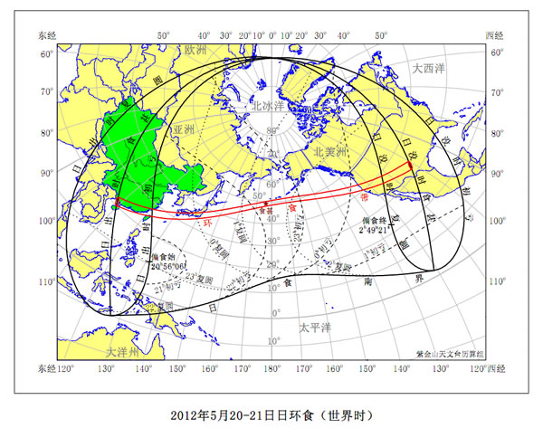 5月21日清晨,广西壮族自治区、海南省北部地区最先看到环食,随后是广东省、江西省、福建省,以及浙江省极南部,之后环食带入海,在擦过我国台湾省北部后,进入我国东海。日本东南部是本次日环食陆上观测条件最好的区域,在这里环食发生期间太阳的地平高度已经比较高了,环食带中心线穿过东京市区。接下来,环食带横跨北太平洋,在美国西南部结束。