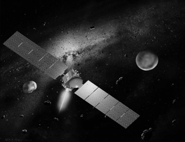 “黎明”号探测器绕灶神星(左)飞行想像图,右侧为谷神星。