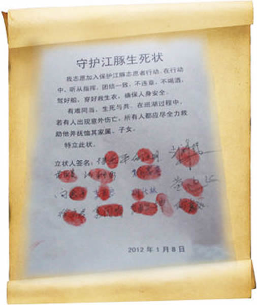 此事被披露之后,相较于“高度重视”的官方,一个民间保护组织——岳阳江豚保护协会的13名渔民志愿者,却早在今年1月8日,就已死士般签下保护江豚的生死状。
