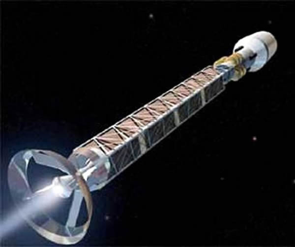 这是美国宇航局马歇尔空间飞行中心的研究人员们绘制的一张未来使用反物质燃料驱动的飞船的示意图