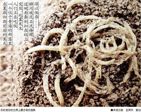 2002年,在青海喇家遗址,考古人员发现一个直径20厘米左右,高10余厘米的倒扣陶碗。随着考古人员将陶碗掀开,4000年前的面条重见天日。