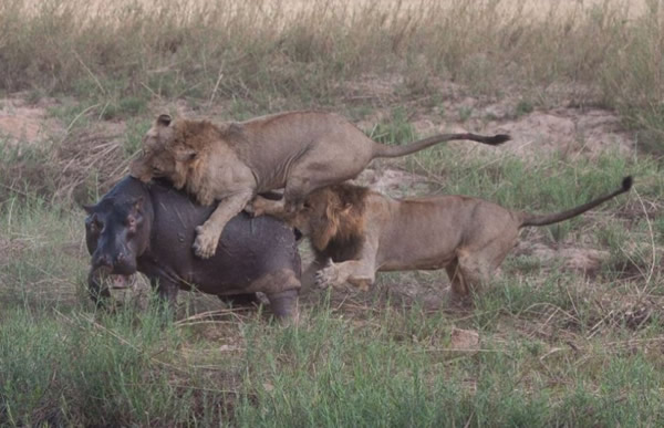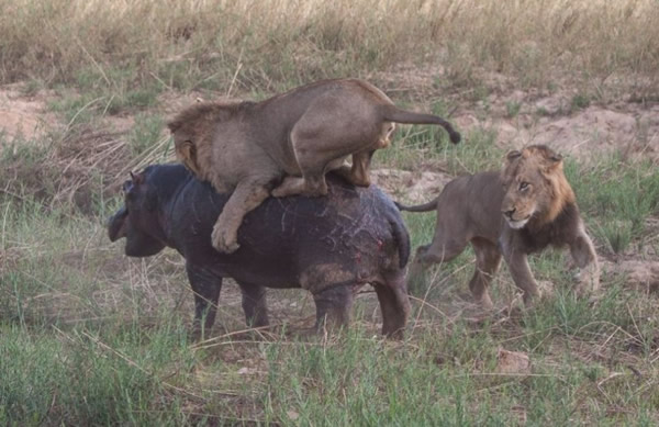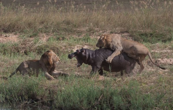 两头狮子展开攻击。一头在河马背上,另一头在后面撕咬。