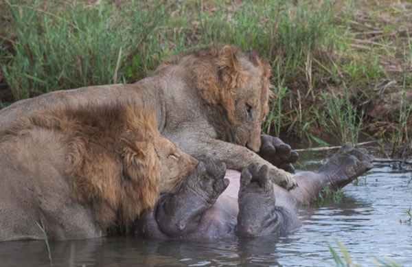 三头狮子用利爪攻击受伤的河马,这次它未能逃脱。斯克曼说:“河马跑进水中,途中狮子依然留在它身上。但这里的水比第一个水塘浅多了,狮子能站起来。它们紧紧抓住不放,试图将河马翻过来。最后,狮子成功了,河马四脚朝天。没过多久,它就不动了,狮子开始大吃起来。”