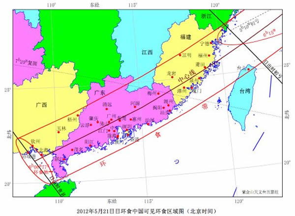 本次环食带将从我国大陆东南部擦过。21日清晨,广西壮族自治区,海南省北部地区最先看到环食,随后是广东省、江西省、福建省,以及浙江省极南部,之后环食带入海,在擦过台湾省北部后,进入我国东海。