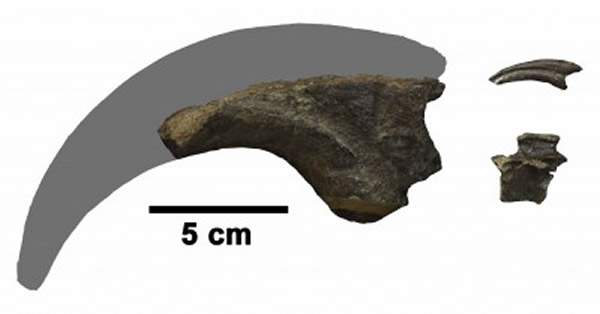 澳大利亚发现的兽脚类恐龙化石,左为大型兽脚类的爪,右为小型兽脚类的爪和椎骨