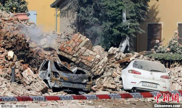 5月20日,意大利北部博洛尼亚发生6.3级地震,造成多人死亡,50人受伤。报道称,此次地震大约持续了20秒,随后又发生了几次余震。地震发生后,部分房屋发生坍塌,一些教堂的尖顶倒塌。图为汽车被废墟压毁。