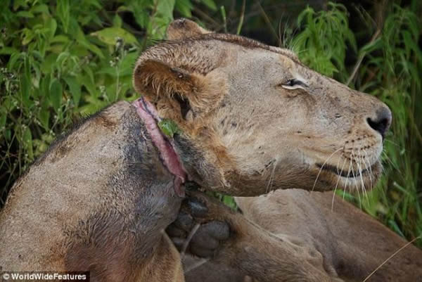 人们在坦桑尼亚北部的米库米国家公园内发现这头年轻的雄性狮子,它的脖子上被一个盗猎者设下的铁丝圈套紧紧地套住