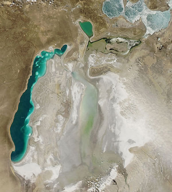 哈萨克斯坦的咸海,是世界四大湖泊之一,覆盖面积达到26000平方英里,但自从上世纪60年代以来,咸海就一直处于缩小状态,甚至前苏联政府的灌溉工程引流河水进入咸海也无济于事。目前的咸海差不多完全是贫瘠的盆地,里面充满着沙子和盐分,现在的咸海面积不足最初面积的10%。咸海面积缩小主要是由于环境因素和地区经济灾难所致。