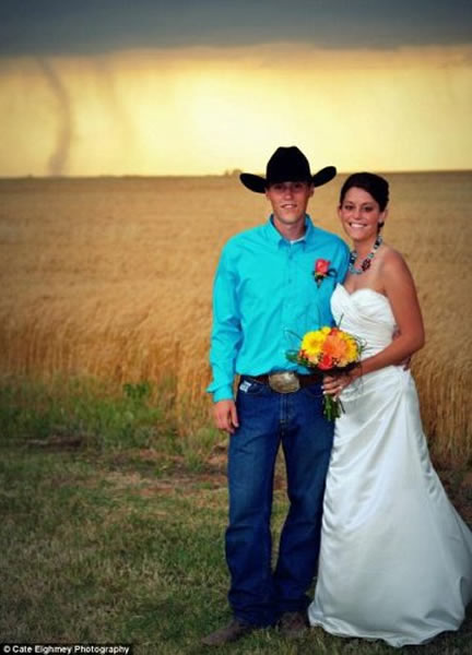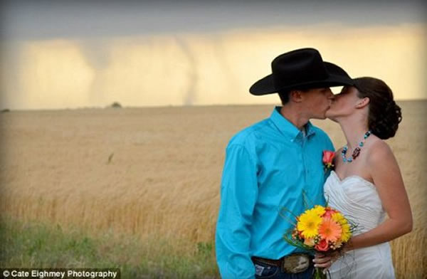 当日,就在这对恋人互相宣誓结为夫妻之后,他们朝窗外看去,只见龙卷风出现在麦田的另一边。天上乌云由斗状云柱与地面接壤,场面尤为壮观。男方凯勒一点也不慌张,拉着女方坎德尔的手走到室外,以龙卷风为背景,在摄影师的镜头下亲吻了自己的新娘。