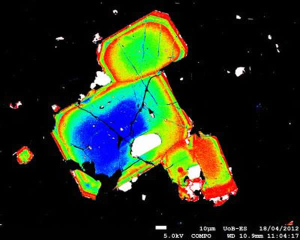 这是一法医式分析1980年圣海伦斯山爆发中采用的划斜晶体的假彩色图像