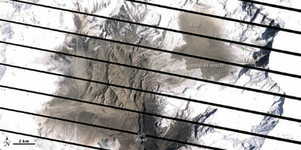 上面的这两幅自然色照片由美国地球资源卫星7号(Landsat 7)分别于2012年5月6日和4月20日拍摄,显示了同一地区在发生山体滑坡和洪水前后的不同景象。照片中的对角线代表卫星故障造成的数据缺失。