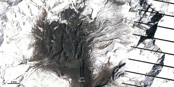 塞提河发源于一个积雪稀少的山谷,四周被峭壁和冰川覆盖的山脉包围。这次山体大滑坡发生7525米高的安纳普尔纳IV峰(Annapurna IV)上。这两幅照片之间最明显的差异是塞提河河东巨大的泥色岩屑带。