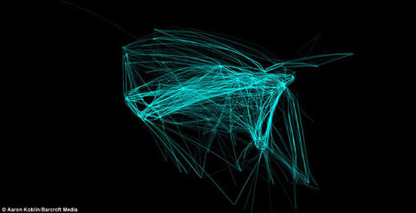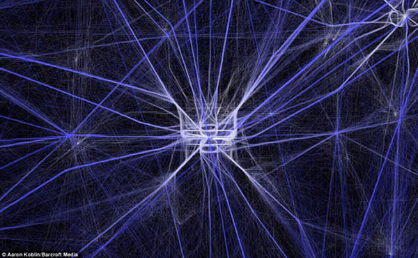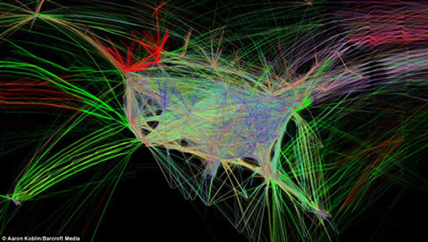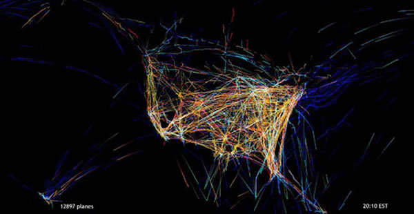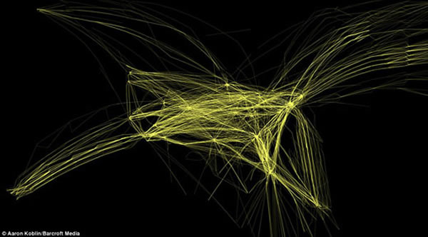 Aaron Koblin描绘出24小时内全美上空的航线图。