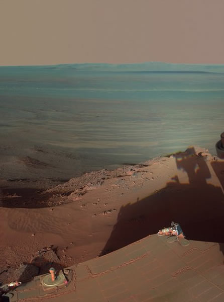 当机遇号火星车苏醒之后,拍摄到14英里直径的奋进号陨坑,机遇号甚至在火星当地时间下午4点半至5点,使用它的全景摄影系统进行“自拍”。
