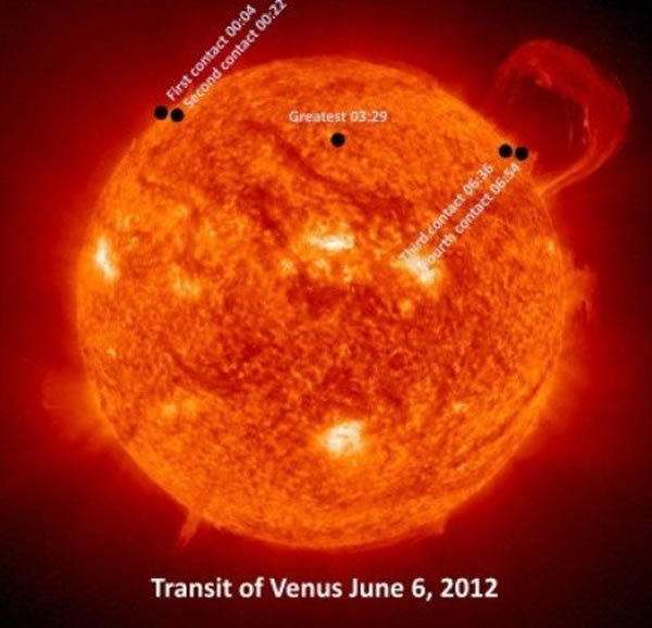 2012年5日至6日发生的金星凌日,持续时间稍低于七个小时,英国地区过境的时间起于6月5日英国夏令时23:04,世界标准时22:04。从第一次金星盘面与太阳盘面发生外切到第一次内切的过程将耗时20分钟。然后金星的运行轨迹将在太阳球面北部横越,凌日中点时间为英6月6日英国夏令时02:30,世界标准时01:30。