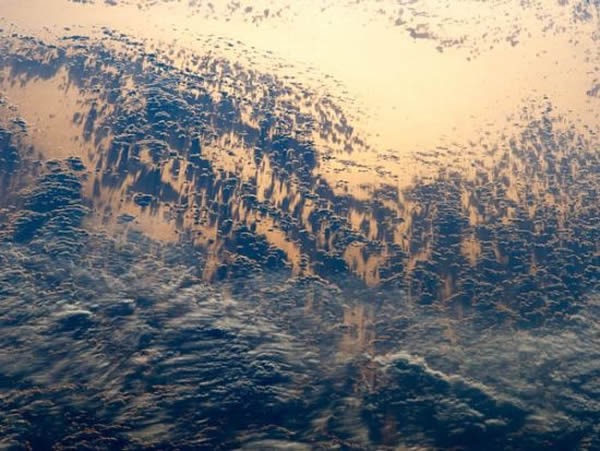 缓缓西落的太阳在太平洋的海面上投下大片的金黄色,低空中有一些云朵,在海面上投下一块块斑驳的阴影。这张充满意境的照片是本月由一位宇航员从国际空间站上拍摄的。