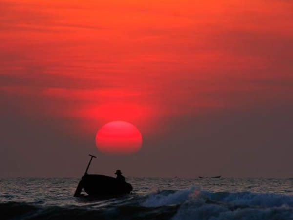 这是越南广义省的海滩边拍摄的日出美景。太阳看上去就像是一个被压扁的土豆。