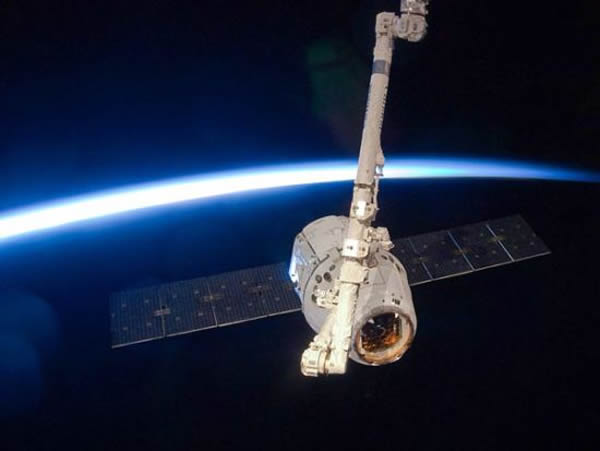 这张照片中,美国太空探索技术公司(SpaceX)的不载人太空飞船“龙”号正被国际空间站的机械臂牢牢抓住。