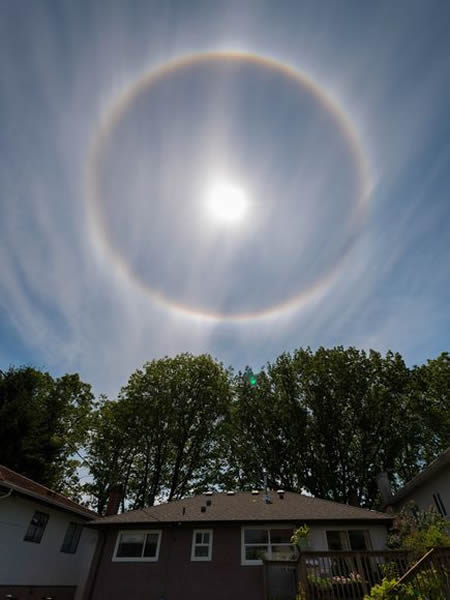 这张照片拍摄于加拿大温哥华,一轮日晕环绕着太阳。日晕是由高空云层中的冰晶体引发的光学现象,它们会折射光线并将其分解为不同的色彩。
