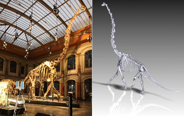 当该技术被应用到测量长颈食草动物——布氏长颈巨龙(参见右图3D骨架模型)的重量时,研究团队发现,虽然布氏长颈巨龙是已知的体型最大的物种之一,体长据估计达到了26米,但其体重可能仅仅略高于23吨。这的确很重,但跟一些此前报道过的对该物种的估算重量相比,要差得很远。以前曾有估算,布氏长颈巨龙重达80吨。