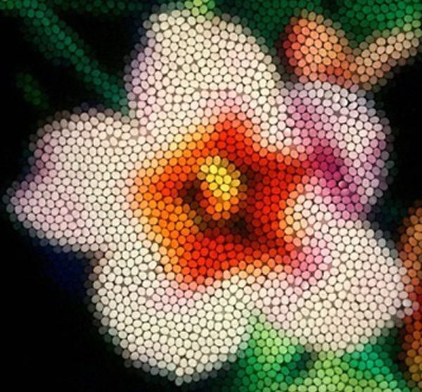 此图显示一朵人眼视为黄色的花在蜜蜂眼中的颜色