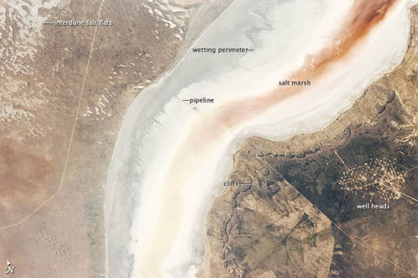 包含凯达克盐沼在内的洼地东部边缘耸立着一些小悬崖。悬崖上面有一个高原——比盐沼约高200米,海拔160米余米——水平向东延伸数百公里。高原上井口密布,如果棕褐色圆点连成的几何图案。相比之下,洼地的西缘(照片左边)仅仅只比盐沼高出10米。照片中央的直线是一条输油管道。