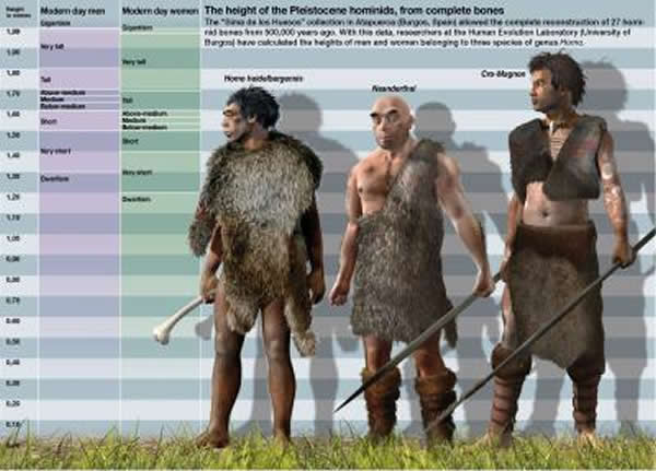 海德堡人(左)、尼安德特人(中)和克罗马农人(右)身高比较