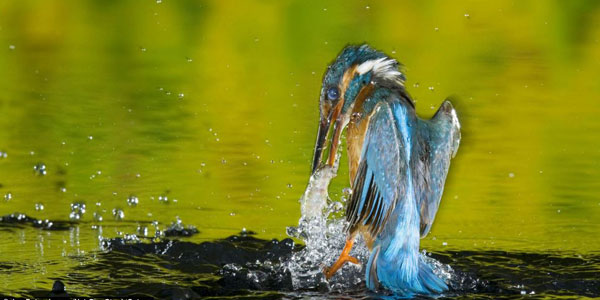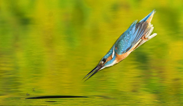 一只蓝色翠鸟像导弹一样俯冲进入湖水,朝向一只鲦鱼