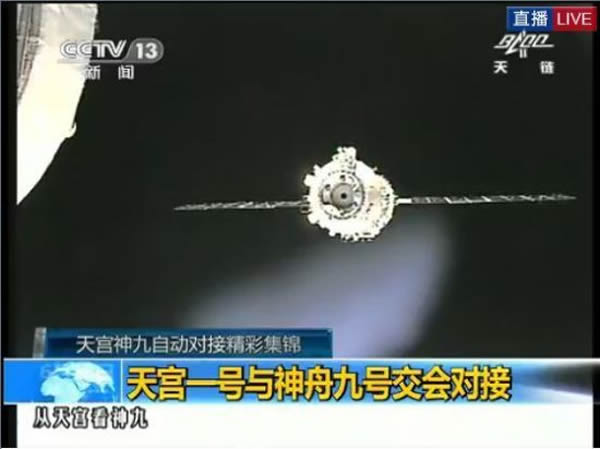 6月18日,神九飞船与天宫一号交会对接的视频截图。