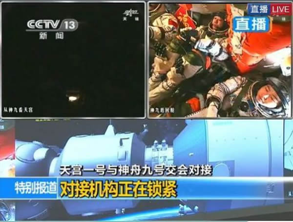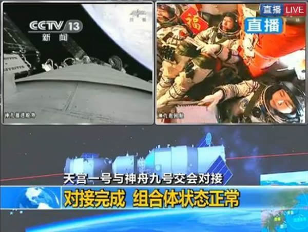 6月18日,神九飞船与天宫一号交会对接的视频截图,画面显示组合体状态正常。