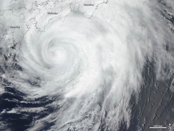 美国宇航局地球观测站今日公布了一张卫星照片,展示了日本热带风暴“古超”的景象