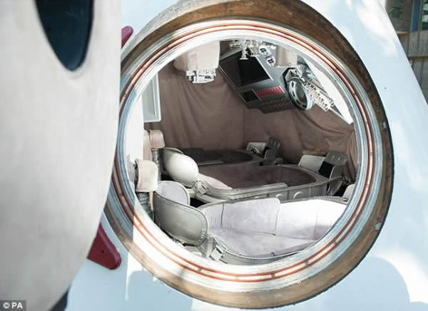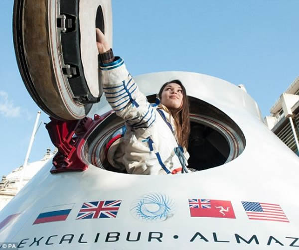 身穿航天服的珍妮佛-桑德进入英国Excalibur Almaz公司的返回舱。她身上的航天服前主人是美国宇航员佩吉-惠特森