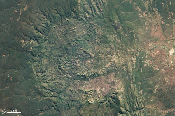 美国宇航局地球观测站今日公布了一张卫星照片,展示了刚果卢伊济河陨石坑的景象。