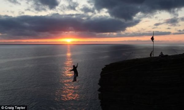 法国冒险家到苏格兰的崖壁上走钢丝并极限跳伞