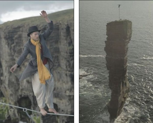 在夕阳的映衬下,这些冒险家背着降落伞,走在矗立于海中央两座高耸巨石间的钢索上,巨石海拔达304米。摄像飞机轰鸣,盘旋于四周,以记录他们此次不同寻常的冒险。这些人从钢索跳下且垂直降落,在空中划出一道道美丽弧线,8秒后他们打开降落伞。