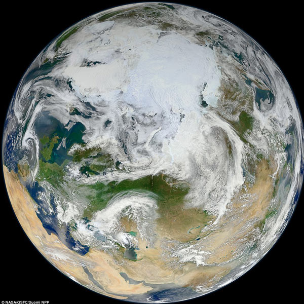 这张图片是从太空拍摄到的地球北极冰盖景象。