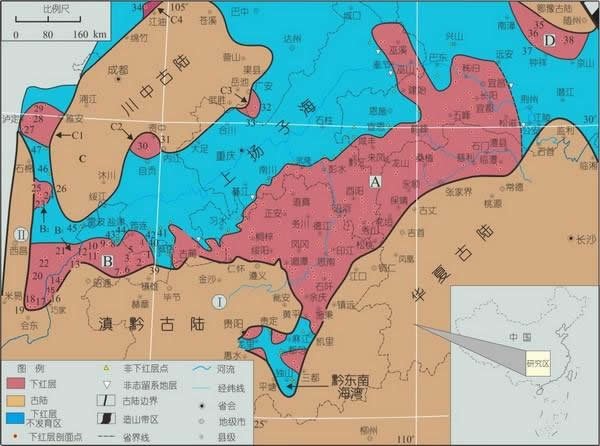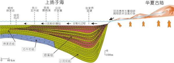 下红层在华夏古陆西北侧和滇黔古陆北侧尤为发育,一般近古陆地区厚度大,远离则减薄至消失。古陆的存在是红层形成的古地理背景,由河流携带的大量含高价铁的细碎屑物是物源,它们堆积在拥有氧化作用的近陆海底;当时区域处于海退态势、海水局部淡化、缺乏上升洋流、营养物质贫瘠、有机生产量低、海盆下沉和沉积速率较快。上扬子区下红层与欧洲同期和华南奥陶纪的远岸较深水红层不同,更与藏南很深、很静、沉积速率很慢、环境稳定的白垩系大洋红层不一样。本项研究着重追踪下红层的时空分布,初步探索其沉积条件和形成环境,为史前浅水海相红层研究提供了实例。