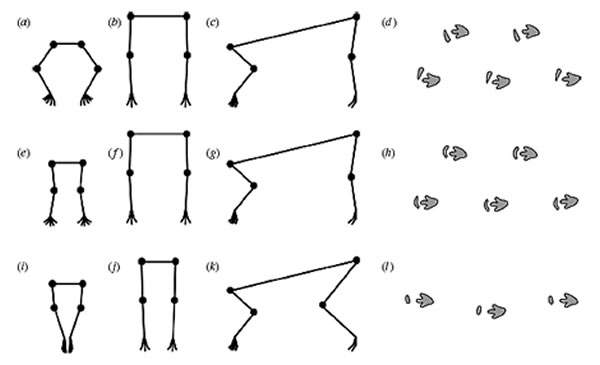 a-d:剑龙和角龙的站姿;e-h:甲龙站姿;i-l:鸭嘴龙站姿;d,h和l是相应的足迹排列。