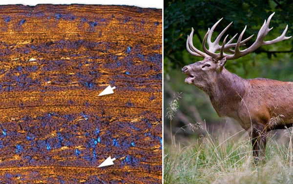 他们发现,所有的物种包括马鹿(右图),都含有停止生长线(见左图骨样本中箭头所指)。尽管这些哺乳动物中此类特征的成因尚未明确,但这项最新的发现表明,停止生长线并不是一种冷血动物的独有构造。所以,就把这个问题看做是又一个依旧待解的恐龙之谜吧。